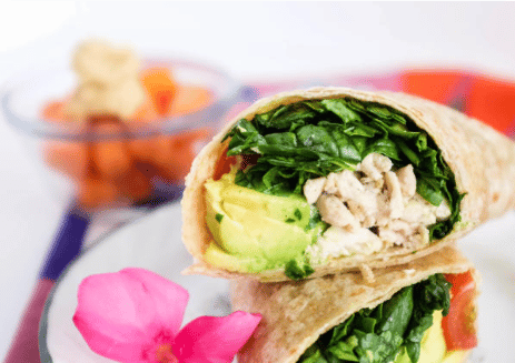 11. Turkey, spinach, tomato, and avocado rolled in a whole wheat tortilla